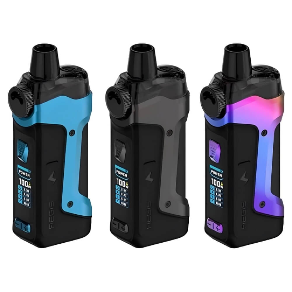 Geek Vape AEGIS Boost PRO 100W Pod Mod Kit, featuring a 5-100W range, temperature control suite, and holds up to 2mL of eJuice within the pod. Constructed from durable zinc-alloy, the chassis of the Geek Vape AEGIS Pro maintains the IP67 rating for dust, shock, and waterproofing. Utilizing a single 18650 battery, sold separately, the Geek Vape Aegis Pro Pod Mod has a bottom threaded battery cap and can output power between 5-100W for delicious vapor creation. Sold separately, users of the Aegis Pro Pod Mod Kit can utilize coils from the B Coil Series in the Aegis Boost Plus Pod, RDTA Pod, and 510 adapter to access use with tanks or rebuildable atomizers.